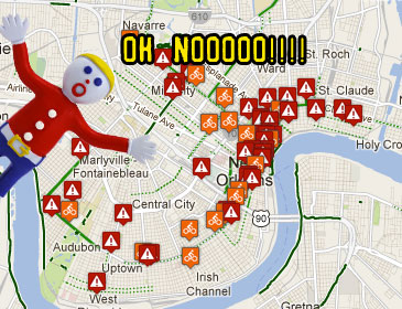A couple summers ago some guys tried to jump me for my bike on Jeff Davis. Several months later that bike got stolen from a public rack. Sure I told friends about these things, and posted a stolen bike notice on the Facebooks, maybe even Craigslist. And of course, nothing came of any of it. So few people actually see those types of posts that they are almost useless. Bikeasy.org has a solution to this though, with an interactive incident and stolen bike map (Ironically enough, discovered on Craigslist this morning). Definitely worth checking out, as is this tasty “Best Of” nugget pulled from the incidents, after the jump.